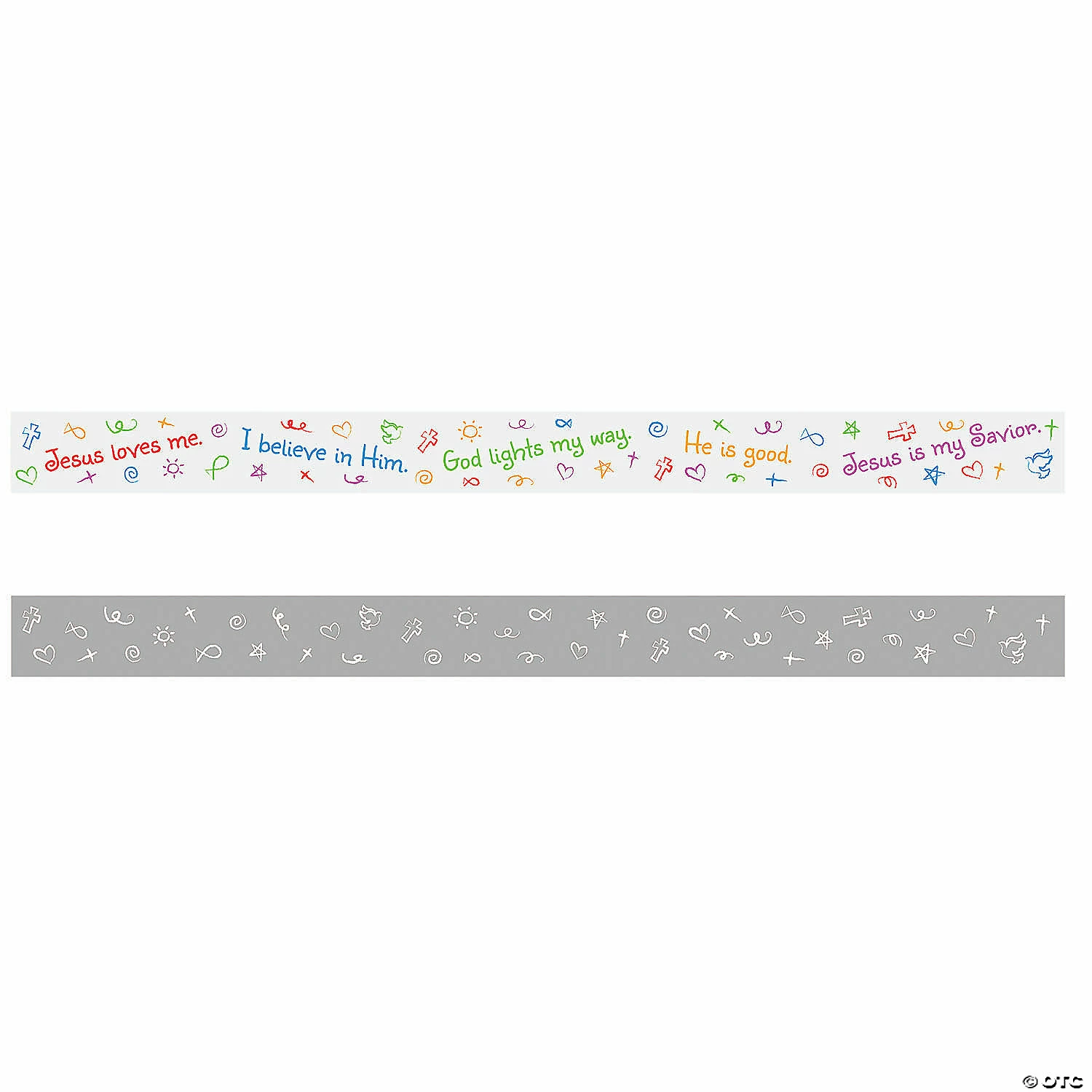 Dress up your Sunday School or Vacation Bible School classroom with these playful bulletin board borders! Flip between colorful messaging like βJesus loves meβ and βGod lights my wayβ on one side and a gray background with white images of doves, crosses and more on the back. Cardstock. (1 dozen per unit) Each, 36″ x 2 3/4″; assembled, 36 ft. x 2 3/4″. Β© OTC