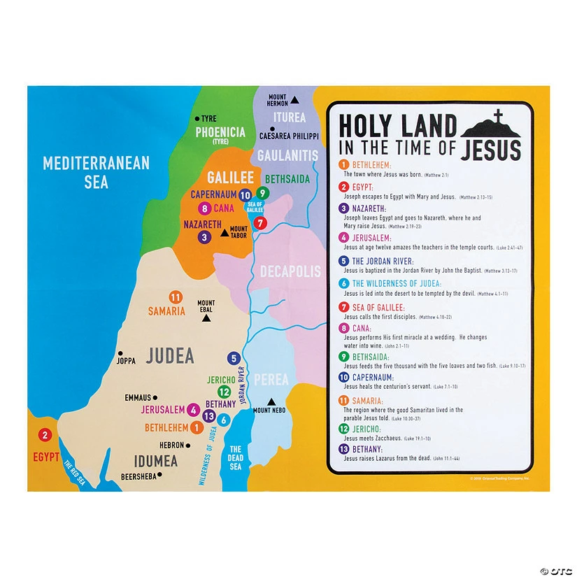 Jesus didnβt stay in one place to perform miracles β He traveled quite a bit! This colorful map helps reveal the travels of Jesus and the miracles he performed in different locations and will bring studying the Bible to another level as readers begin to understand the geography of the Messiahβs travels. Keep the map nearby while reading the Bible and reference it often! Paper. 22″ x 17″ Β© OTC